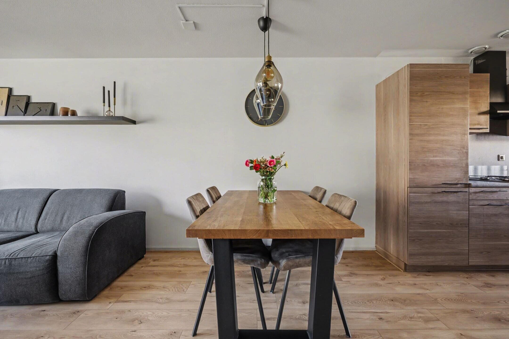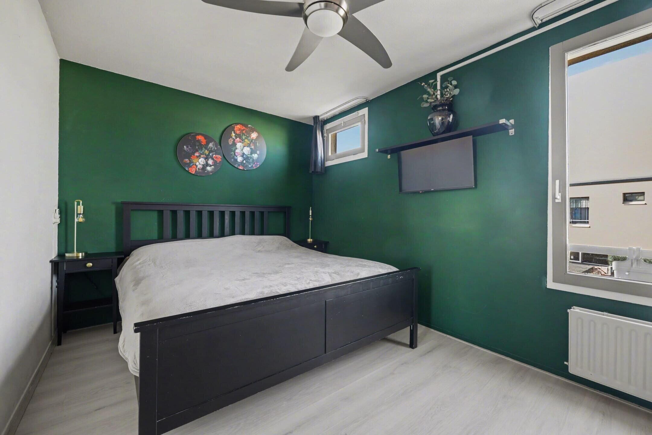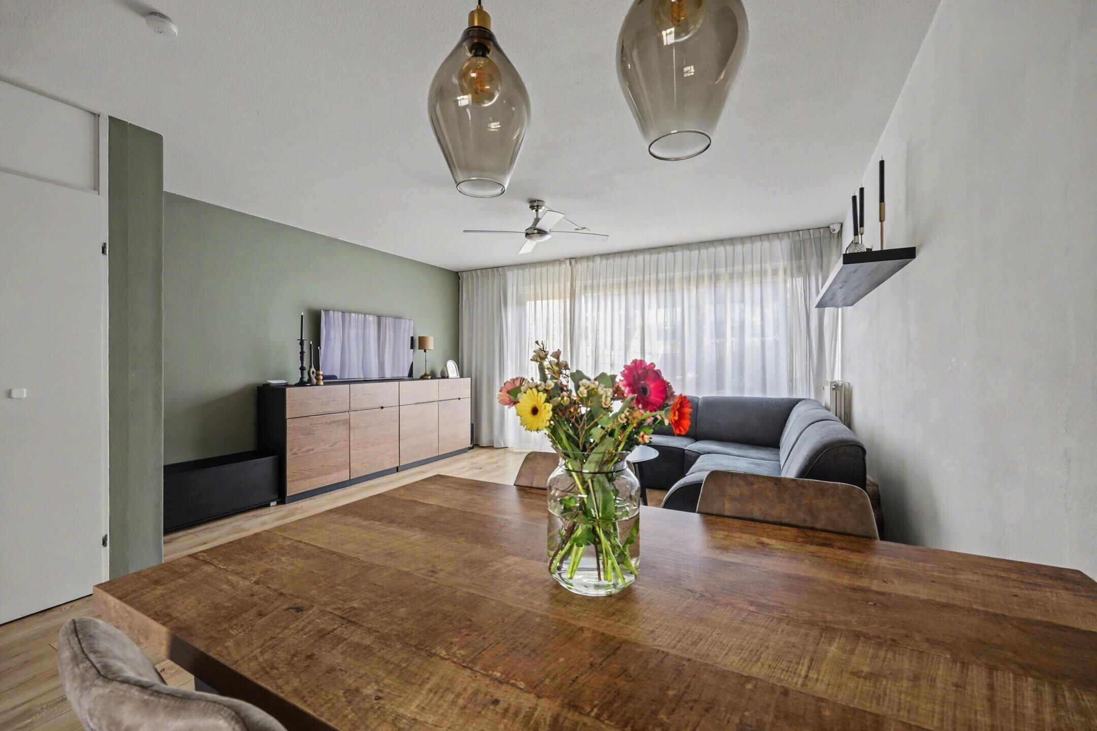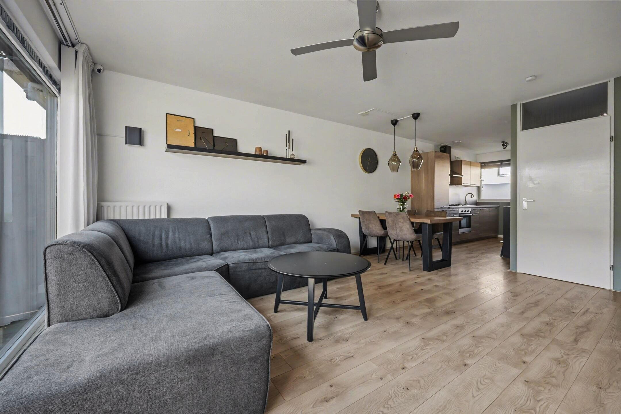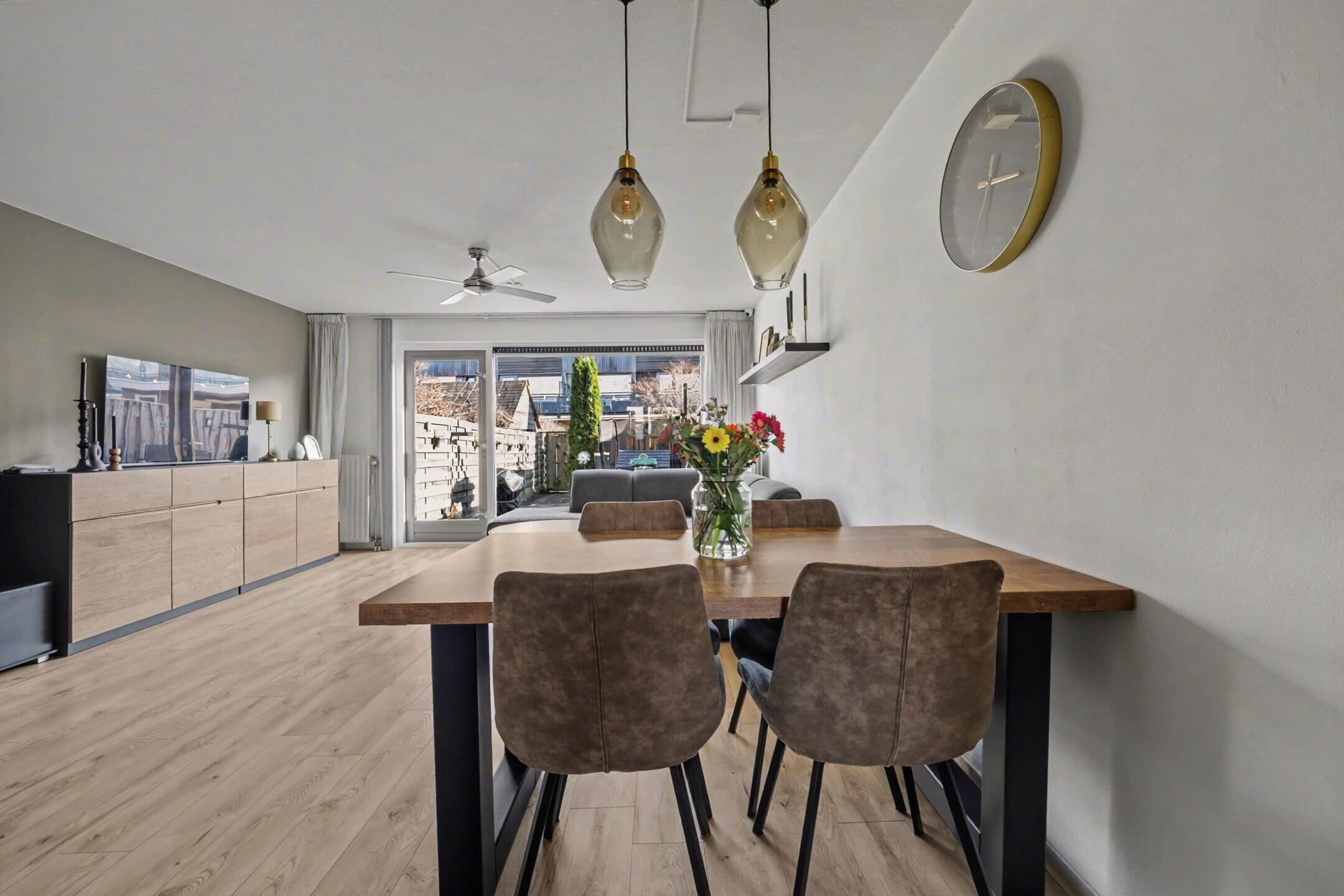 The garden facing living room is wonderfully bright thanks to the large windows and offers a beautiful view of the backyard. The space is neatly finished and feels spacious and comfortable. From the living room you can walk straight into the garden, creating a pleasant connection between indoor and outdoor living.