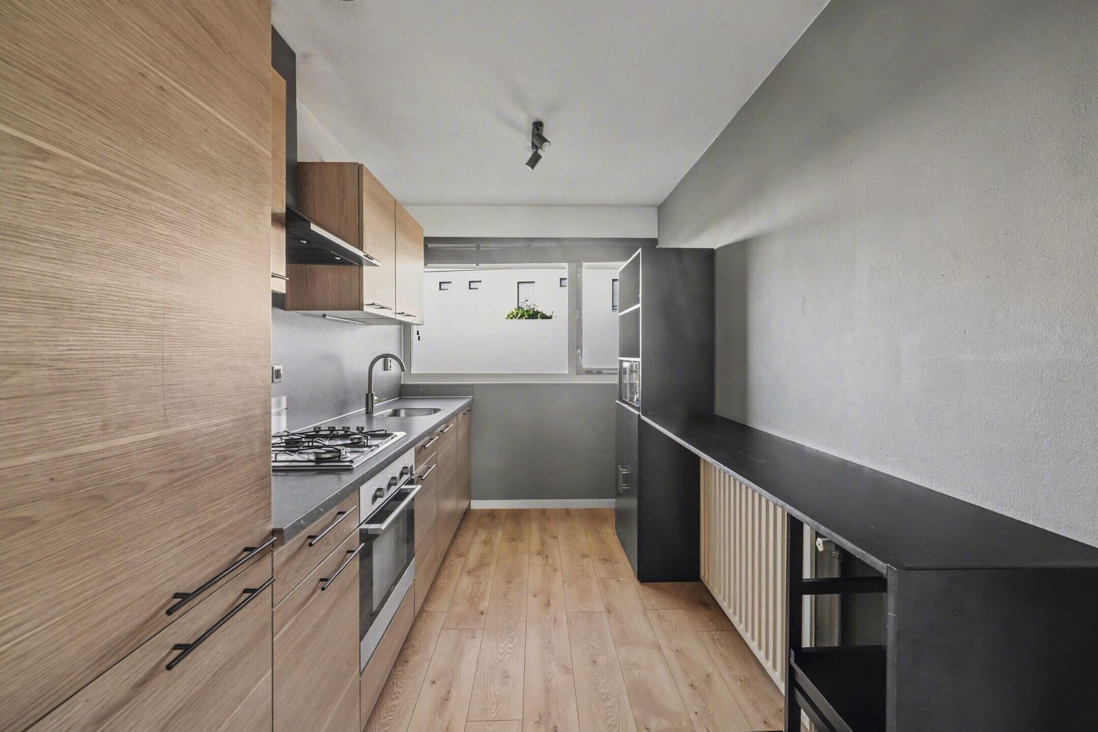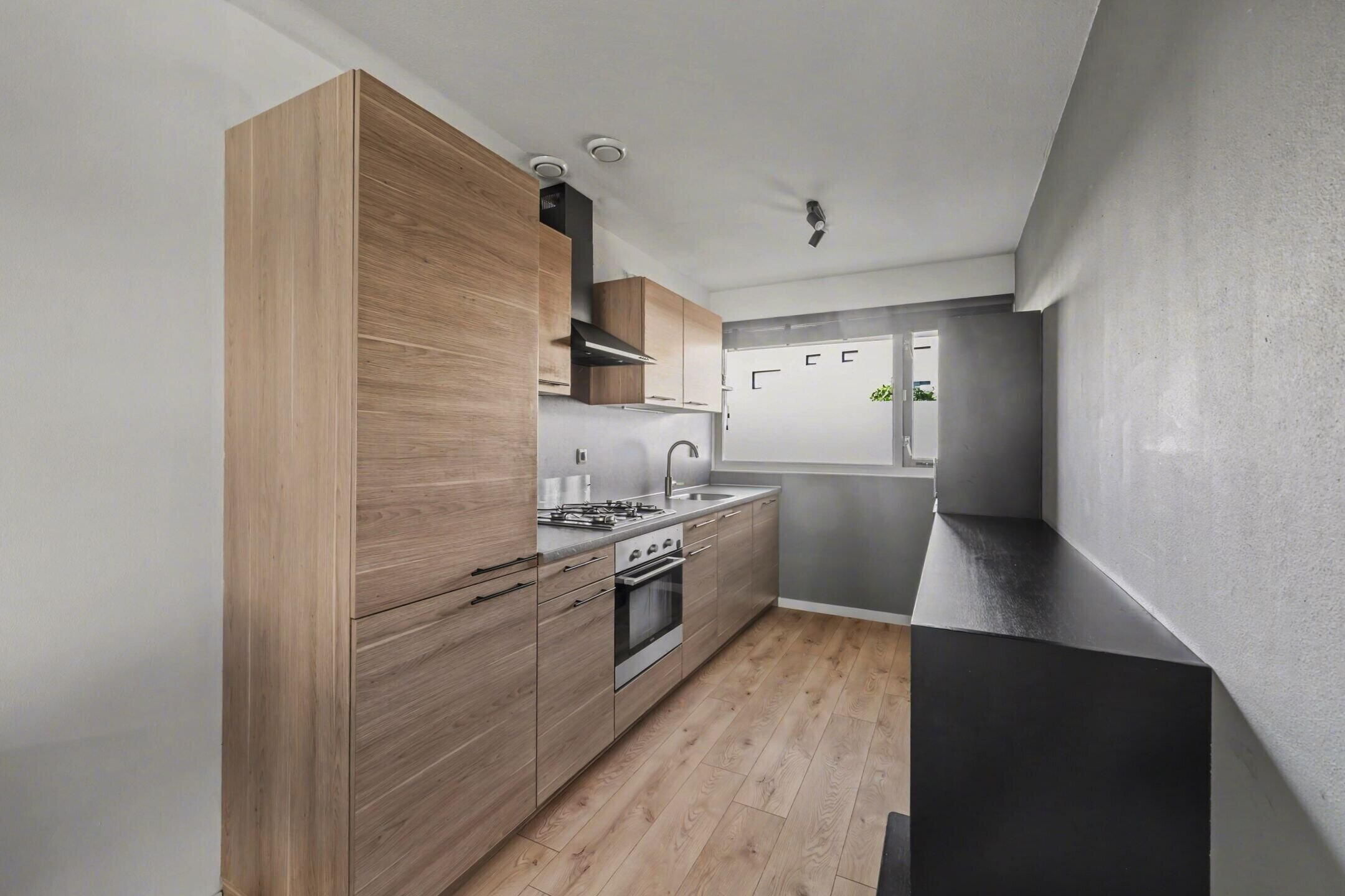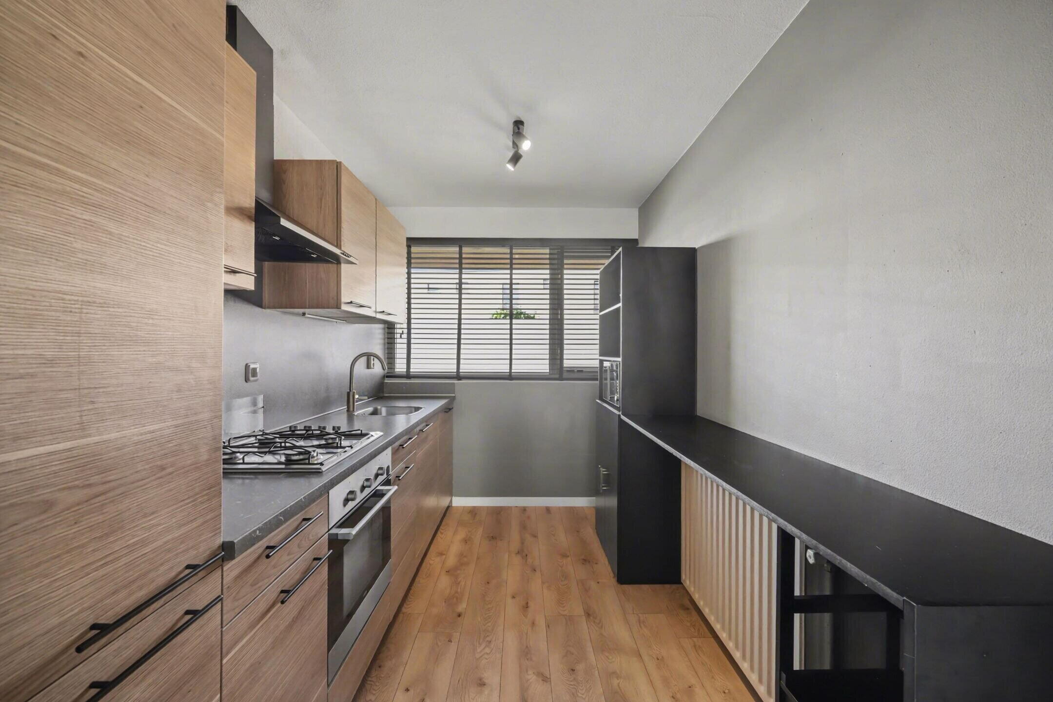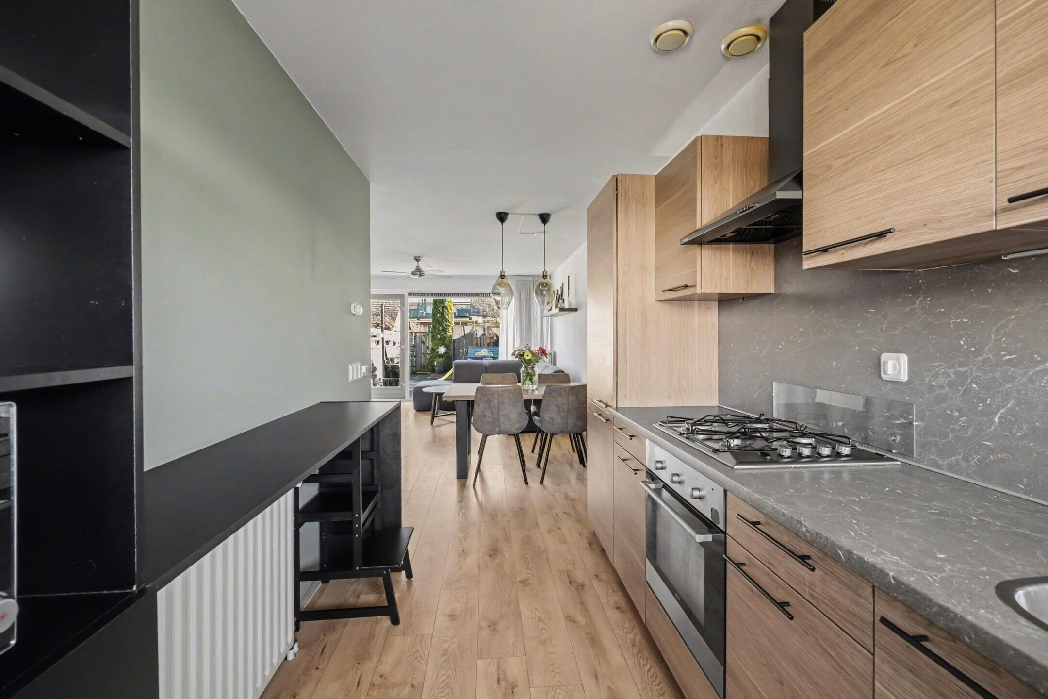 Aan de voorzijde bevindt zich de open keuken, verzorgd uitgevoerd en voorzien van diverse inbouwapparatuur. Ook hier zorgt de grote raampartij voor veel daglicht en een prettig uitzicht over de rustige straat.